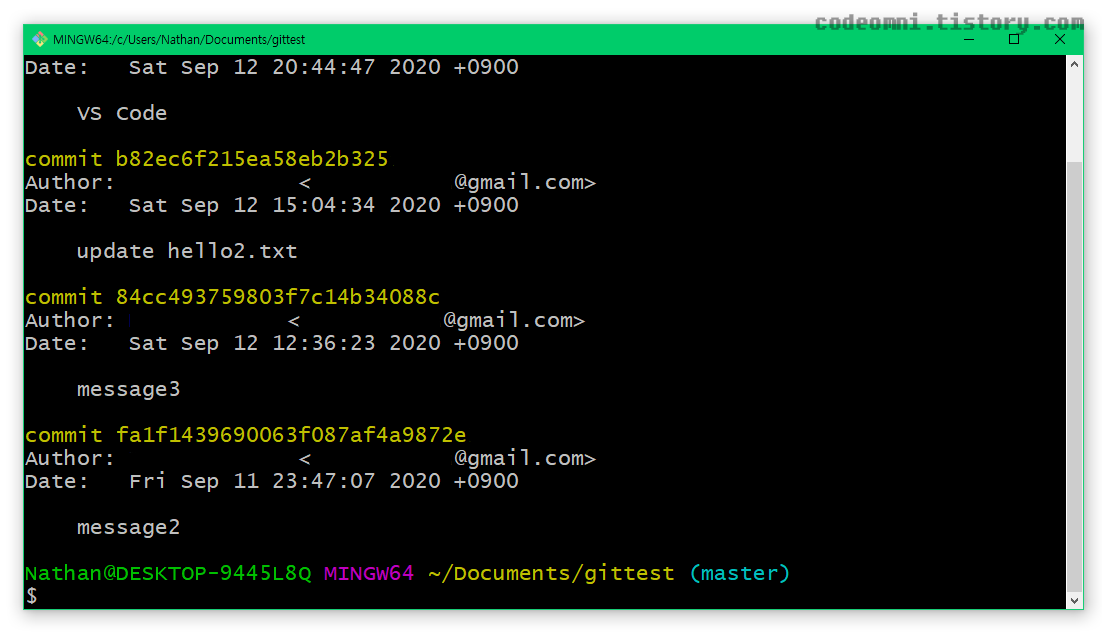 커밋한 로그를 확인하기 위해서 git log를 사용합니다.