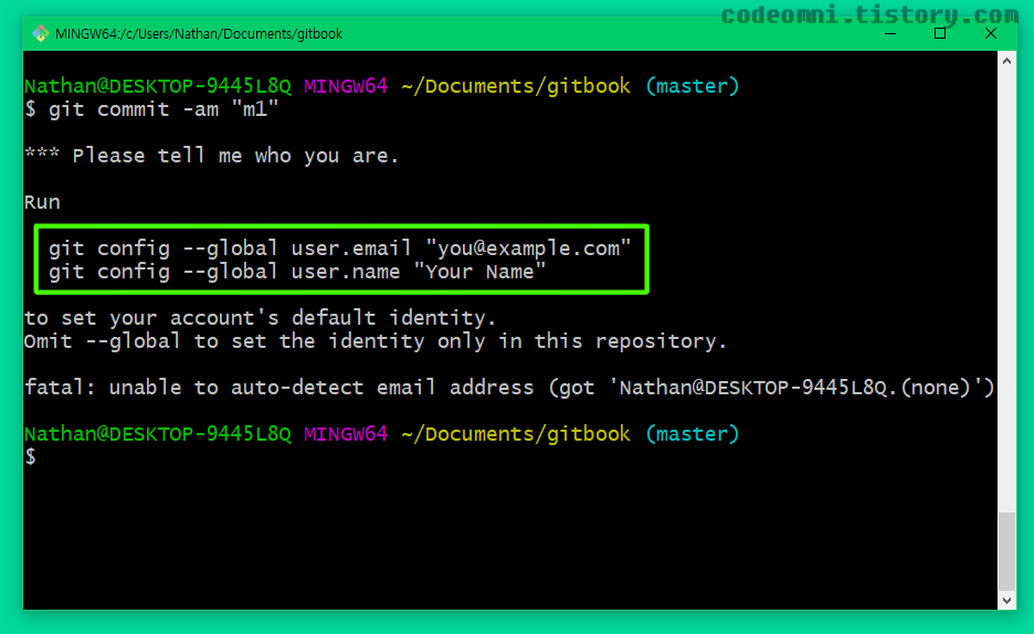 깃을 사용할 때 커밋하는 사람이 누구인지 물어보는 에러가 발생합니다.