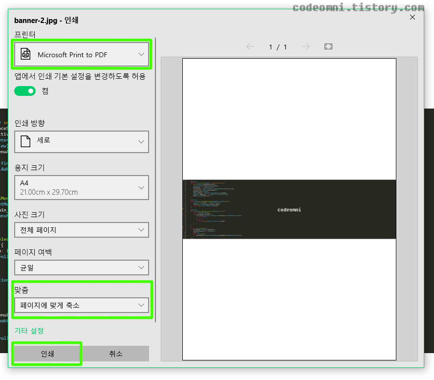 ▲ 맞춤에서 페이지에 맞게 축소를 클릭합니다.(사진이 짤리지 않습니다.)