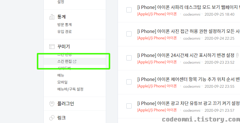 ▲ 티스토리 관리자 페이지에 들어가서 스킨 편집를 클릭합니다.