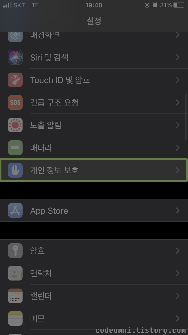 ▲ 설정에서 개인 정보 보호를 터치합니다.