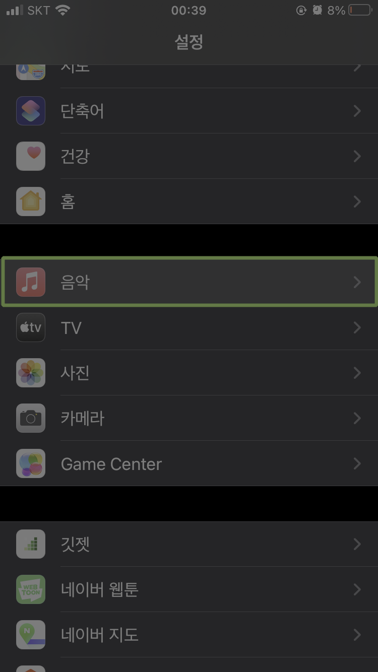 ▲ 설정에서 음악을 터치합니다.