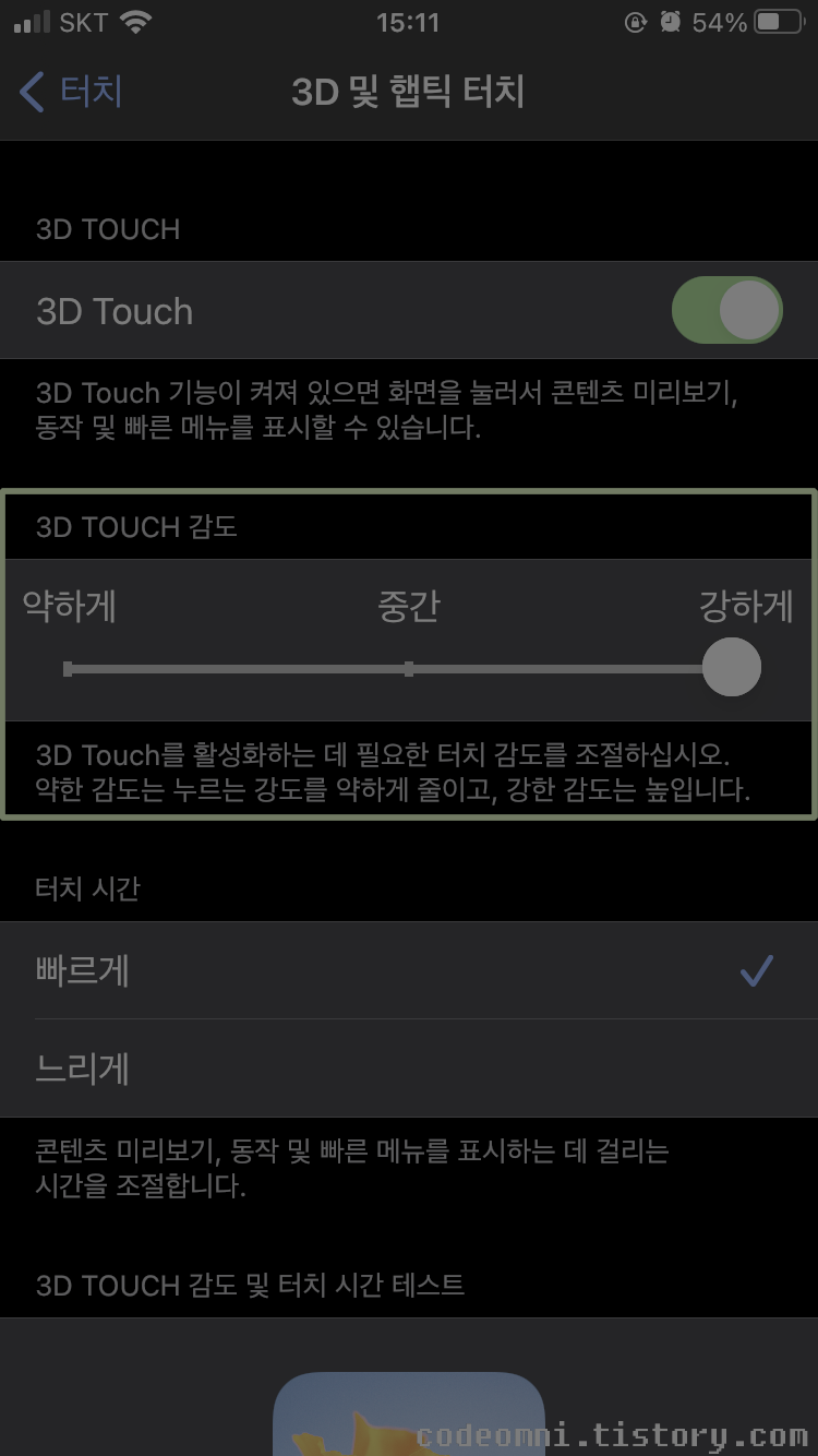 3D Touch를 활성화하는 데 필요한 터치 감도를 조절합니다.