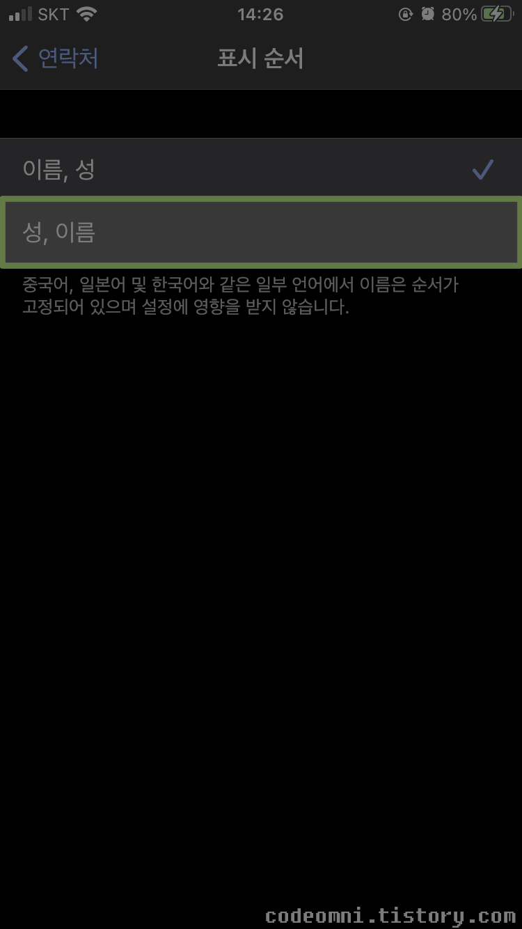연락처 앱에서 표시되는 성과 이름 순서를 바꾸는 방법입니다.