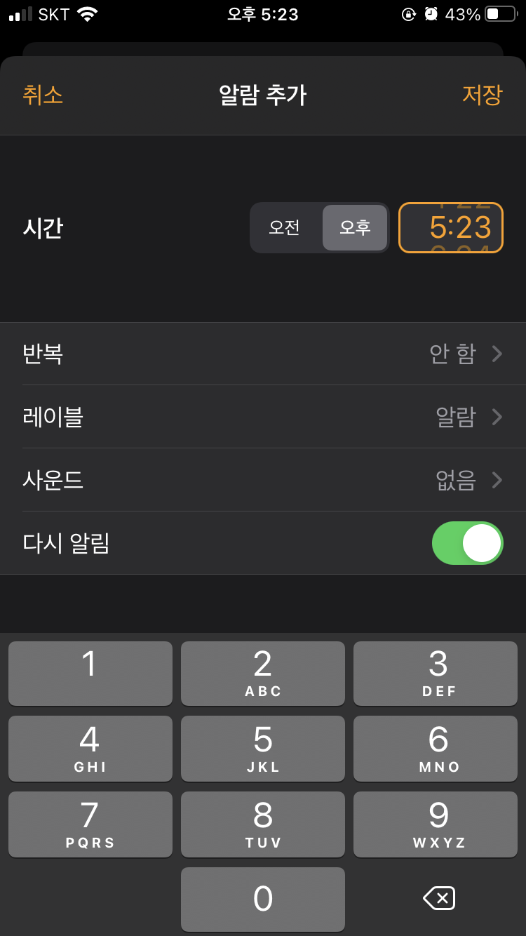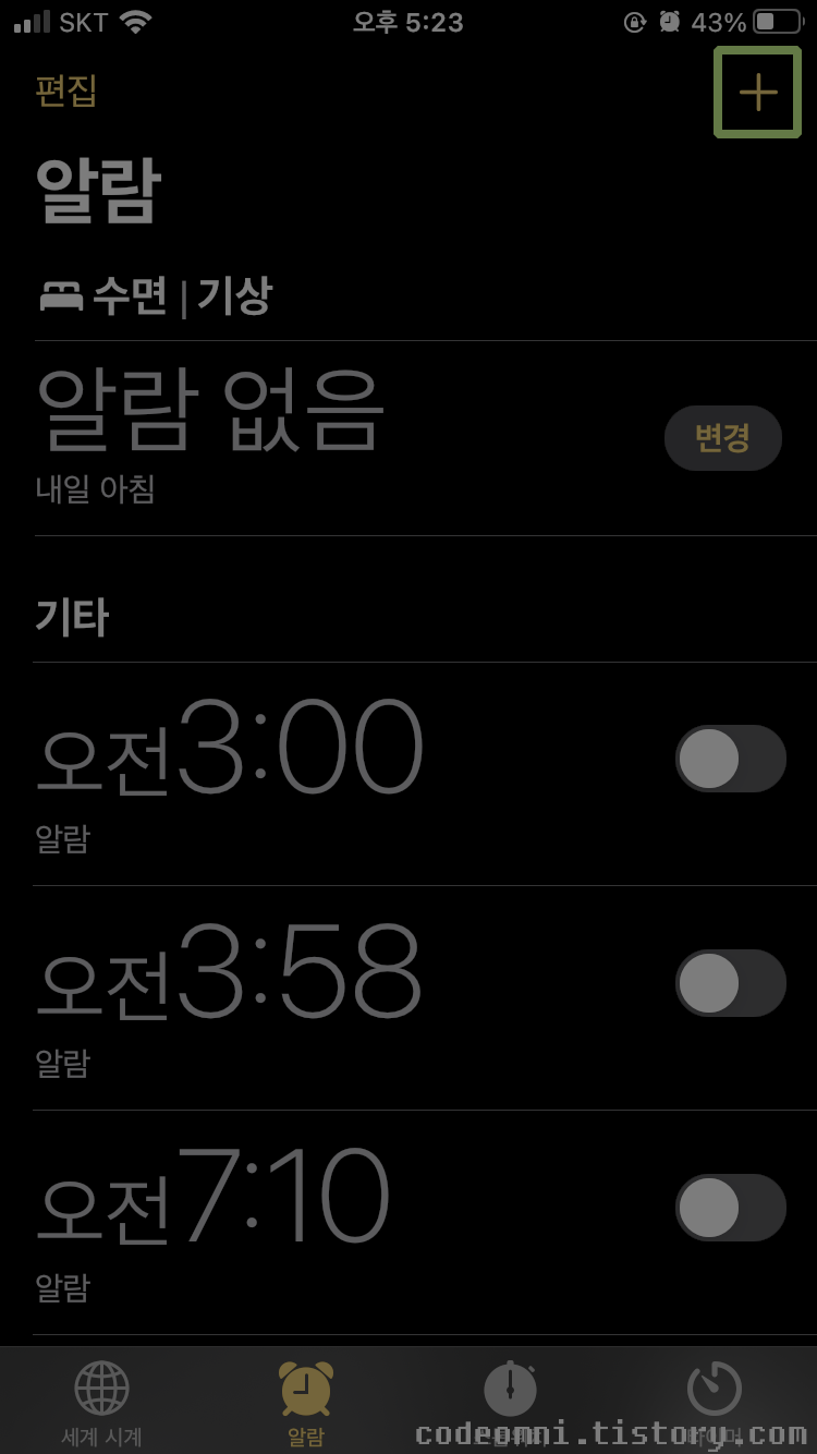 ▲ 시계앱의 알람에서 + 버튼을 터치합니다.
