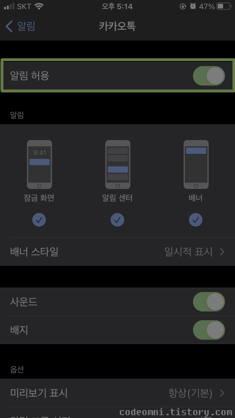 설정 앱에서 카카오톡의 모든 알림을 끄는 방법입니다.