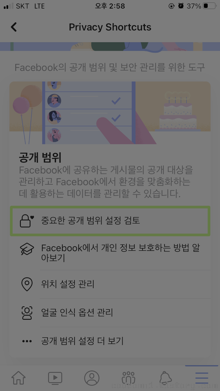 ▲ 공개 범위에서 중요한 공개 범위 설정 검토를 터치합니다.