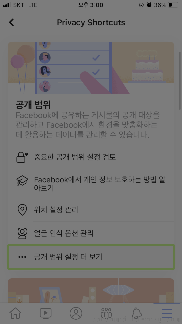 ▲ 설정과 공개 범위에서 공개 범위 설정 바로가기를 터치합니다.