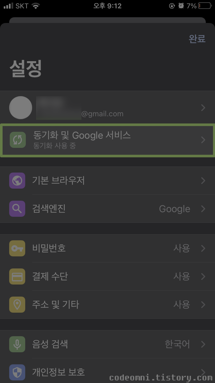 구글 계정으로 PC나 폰에서 동기화하는 기능을 변경합니다.