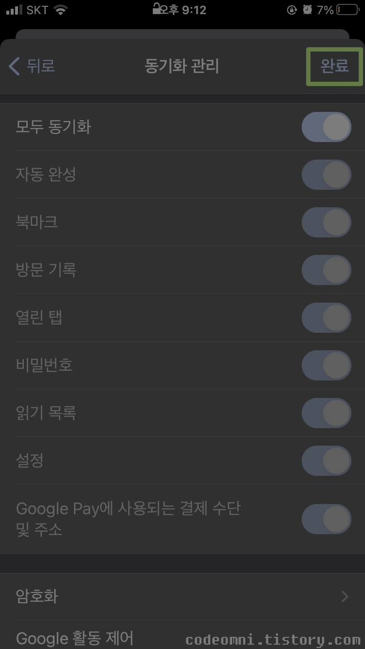 선택적으로 자동완성, 북마크, 방문 기록, 열린 탭, 비밀번호, 읽기 목록, 설정, Google Pay에 사용되는 결제 수단 및 주소를 동기화도 가능합니다.
