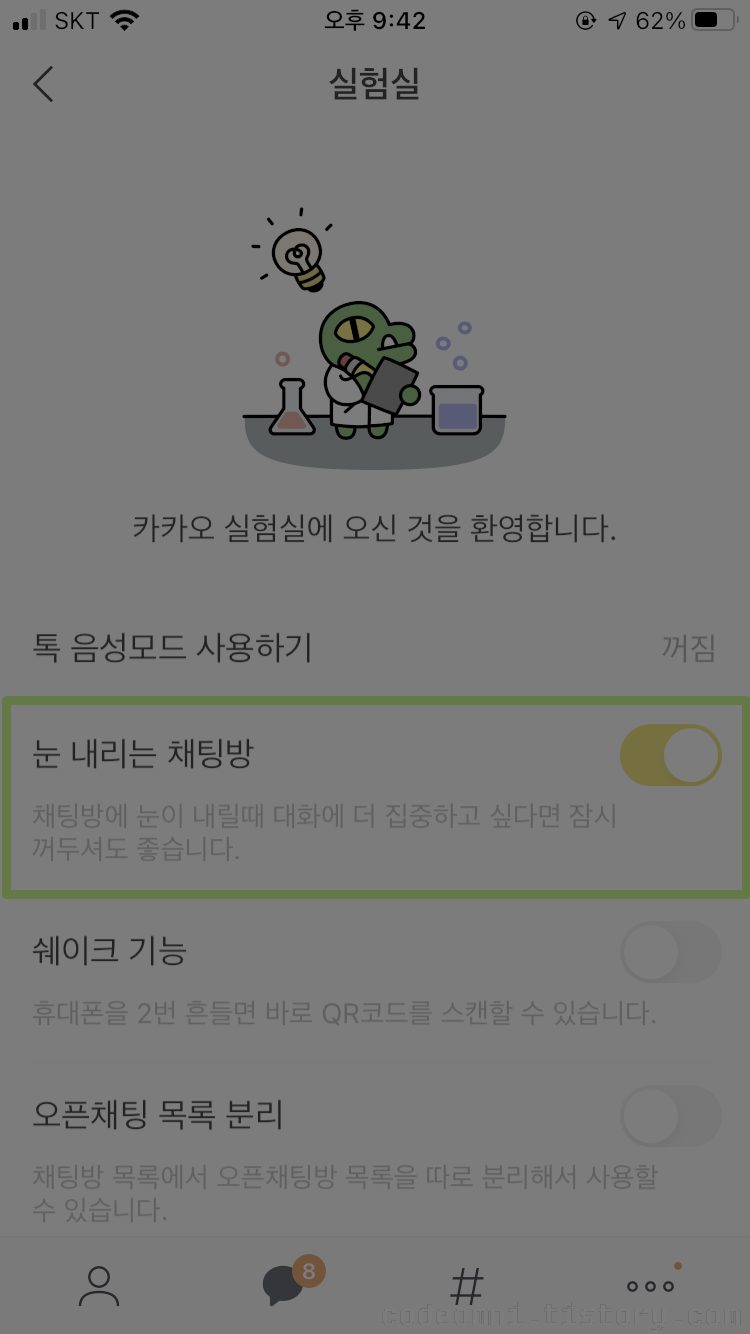 채팅방 배경에서 눈 내리는 효과를 끄거나 켜는 방법입니다.