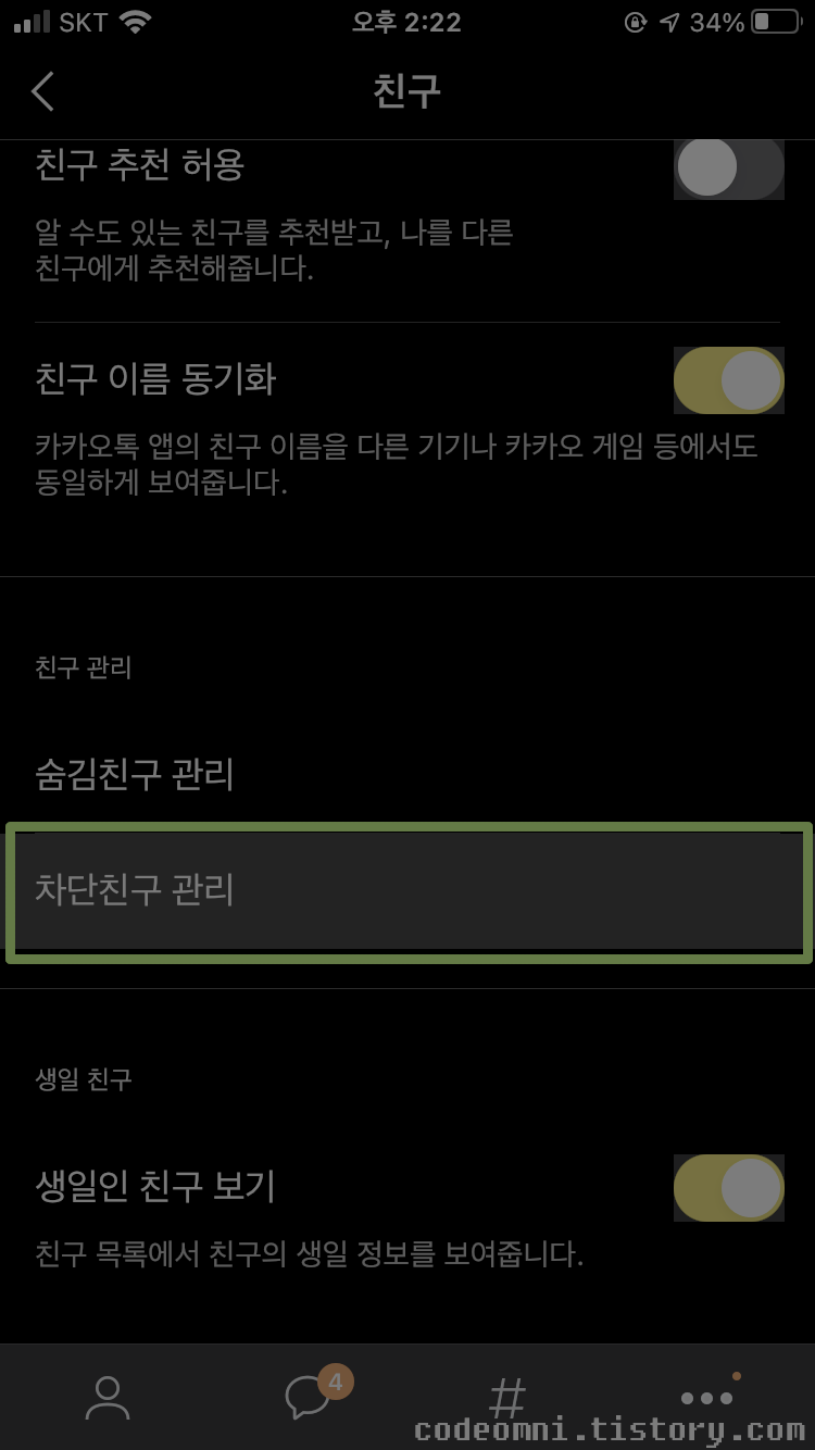 카카오톡 앱에서 차단친구를 모두 확인하는 방법입니다.
