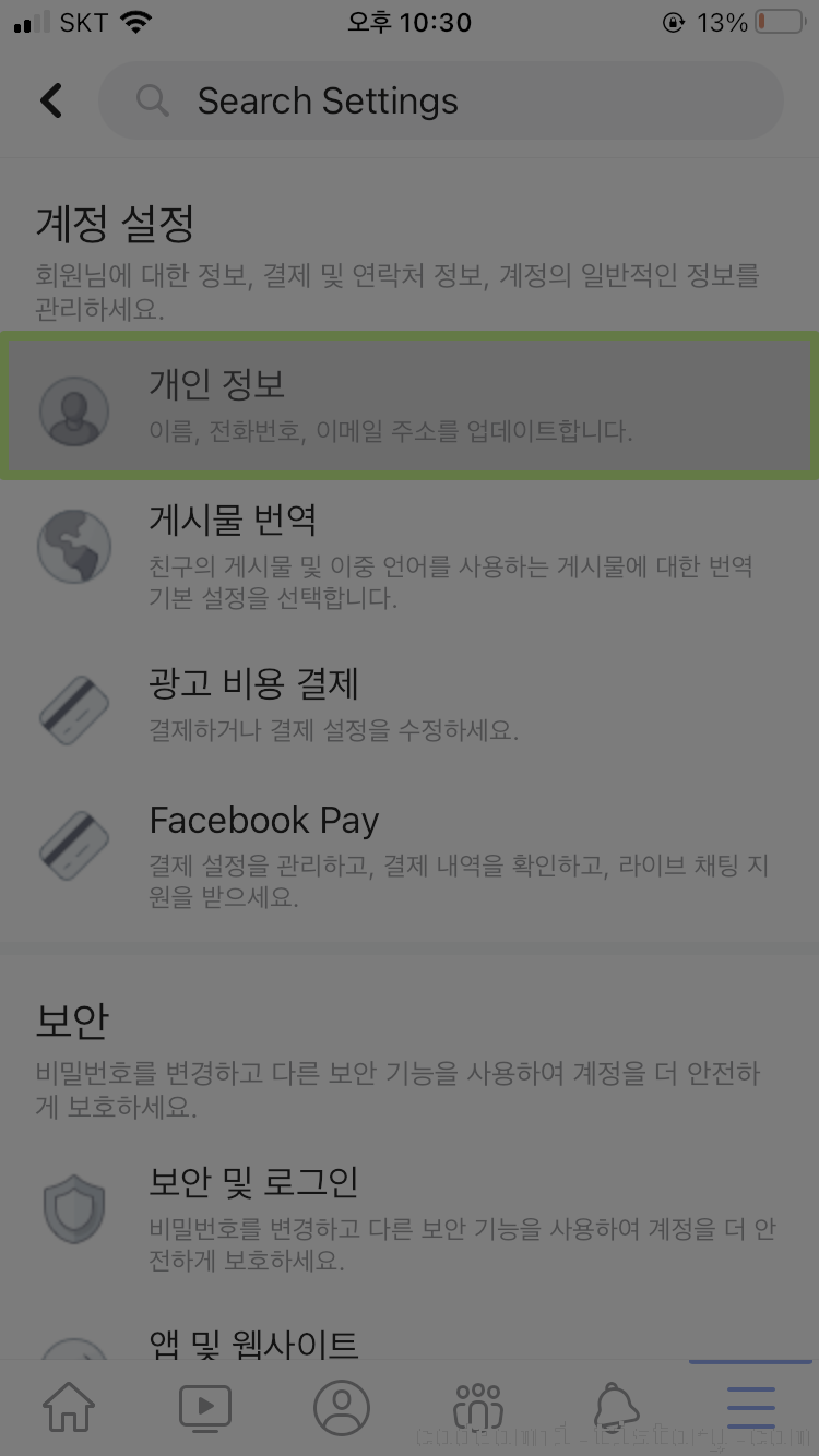 ▲ 계정 설정에서 개인 정보를 터치합니다.