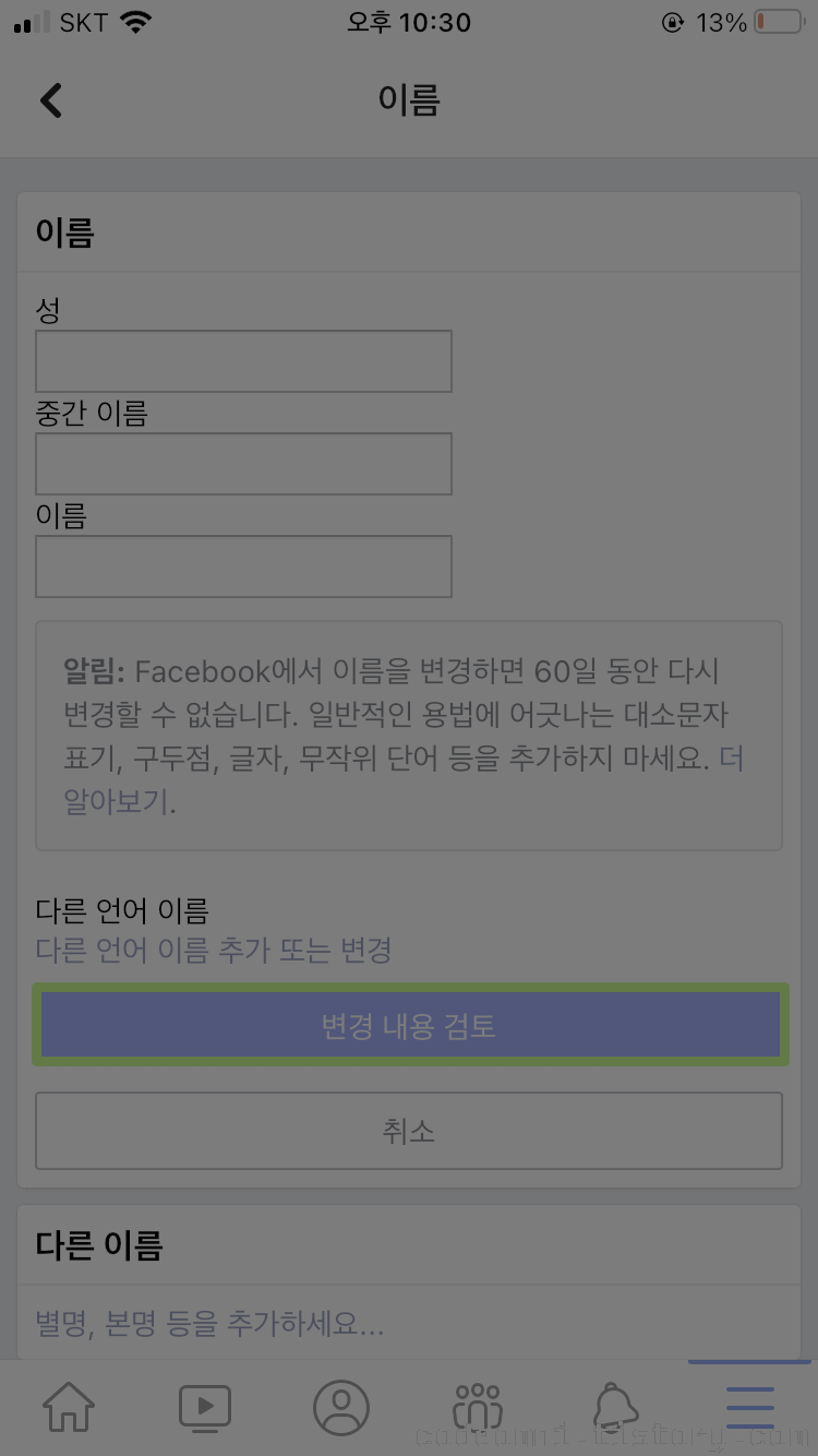 이번 포스팅은 페이스북 앱의 프로필 성과 이름 변경하기입니다.