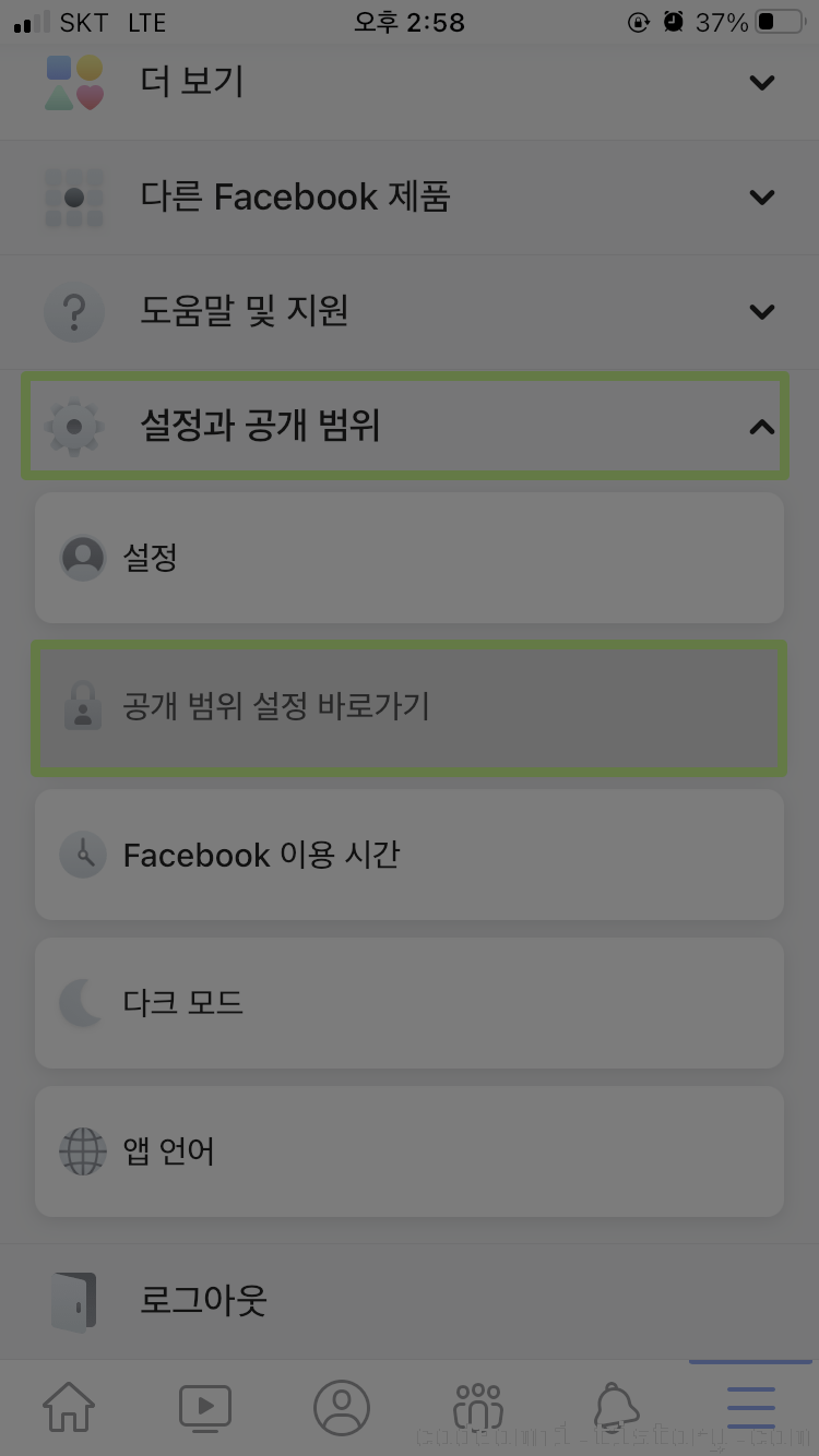 ▲ 설정과 공개 범위에서 공개 범위 설정 바로가기를 터치합니다.