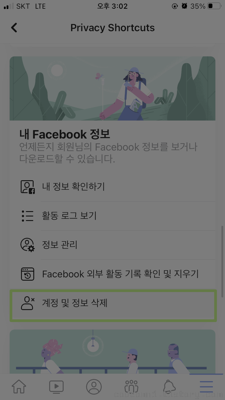 ▲ 스크롤 하여 내 Facebook에서 계정 및 정보 삭제를 터치합니다.