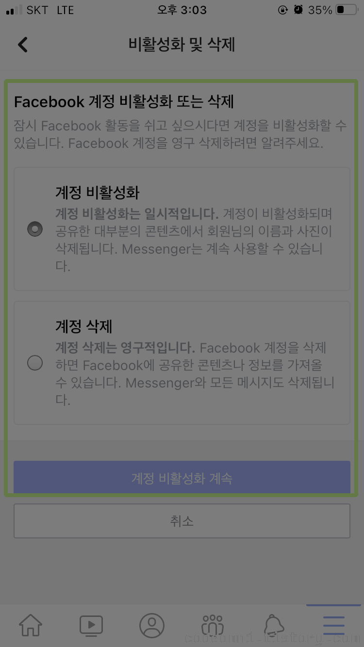 ▲ 계정 비활성화를 선택한 후 계정 비활성화 계속을 터치합니다.