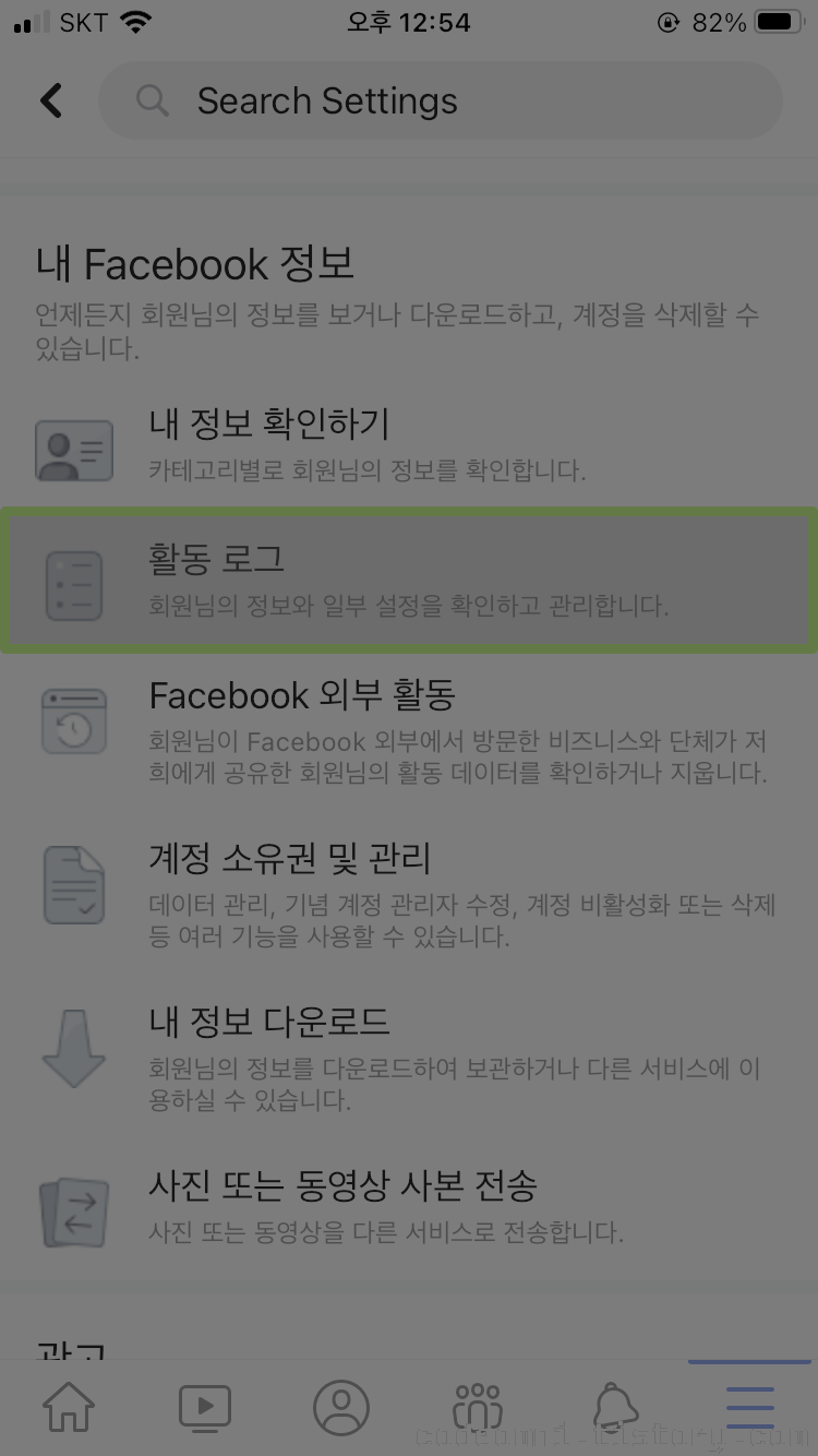▲ 내 Facebook 정보에서 활동 로그를 터치합니다.