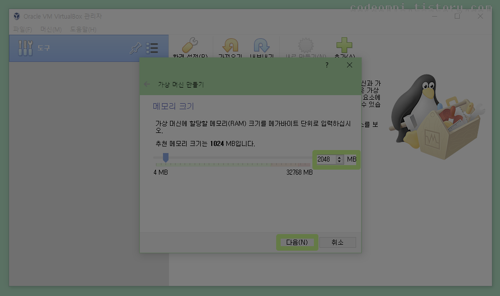 ▲ 가상 머신 메모리 크기를 지정합니다.