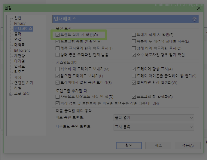 ▲ 옵션 표시에서 토렌트 삭제 시 확인(O)을 클릭을 해제합니다.(자동 업데이트 켜짐 끔)