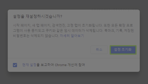 시작 페이지, 새 탭 페이지, 검색엔진, 고정 탭이 초기화됩니다. 또한 모든 확장 프로그램이 사용 중지되고 쿠키와 같은 임시 데이터가 삭제됩니다. 북마크, 기록, 저장된 비밀번호는 삭제되지 않습니다.
