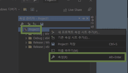 ▲ 생성한 속성 시트에서 마우스 우클릭을 하여 속성(R)을 클릭합니다.