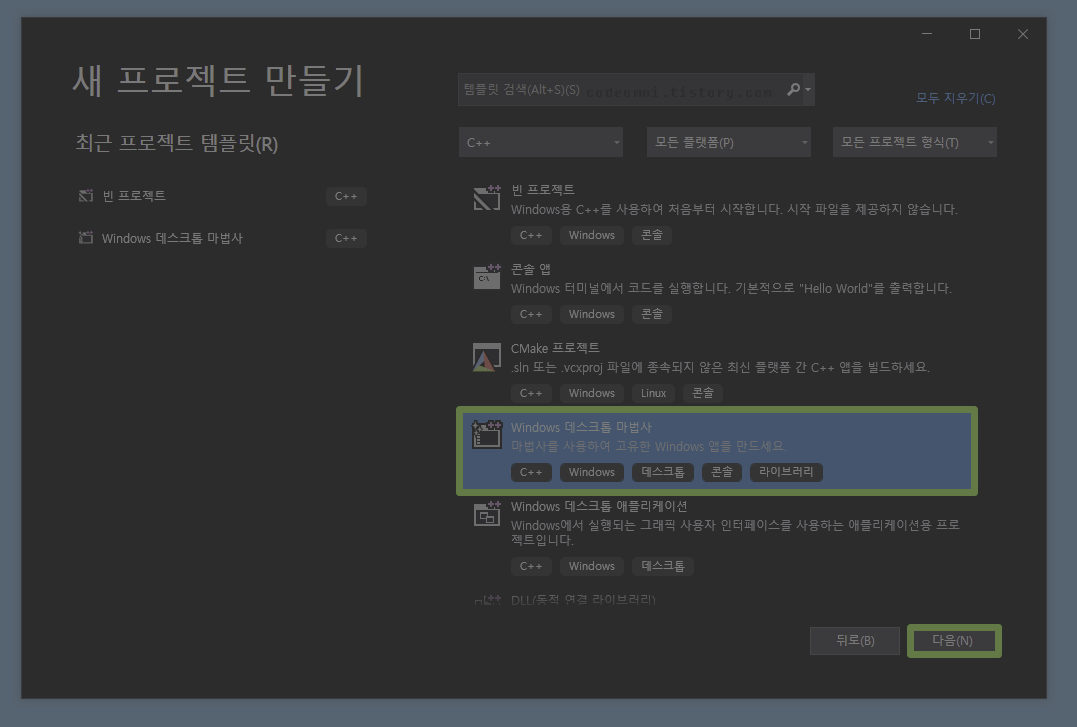 ▲ Visual Studio에서 새 프로젝트 만들기의 Windows 데스크톱 마법사를 클릭합니다.