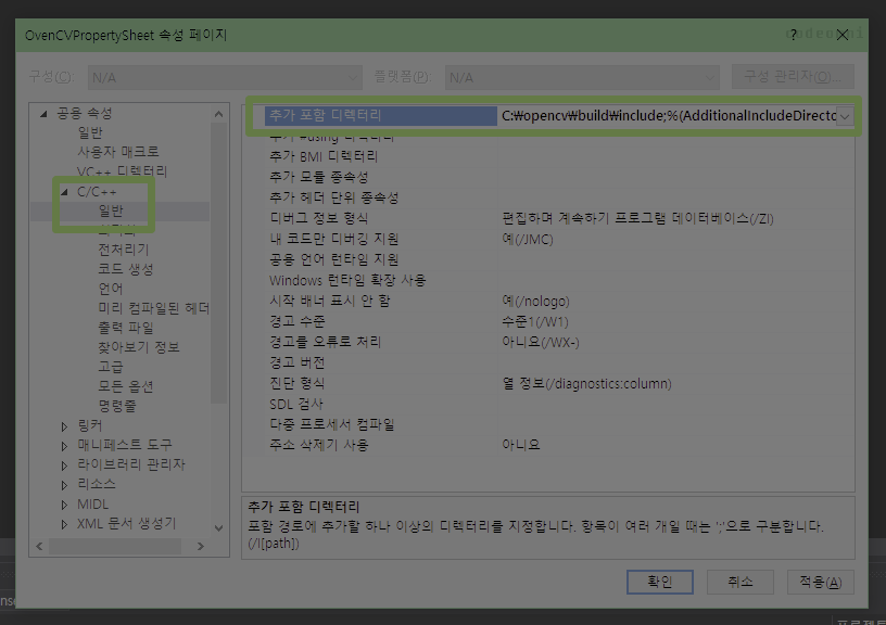 ▲ 공통 속성 - C/C++ 에서 추가 포함 디렉터리에 C:\opencv\build\include 의 경로를 넣습니다.