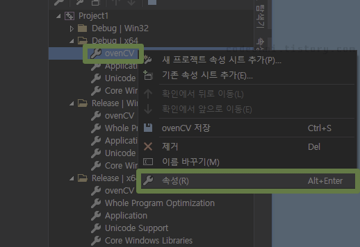 ▲ OpenCV의 새 프로젝트를 생성할 때마다 방금전에 생성한 속성시트를 불러옵니다.