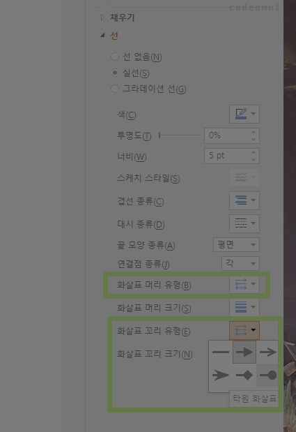▲ 화살표 머리와 꼬리를 클릭하여 모양를 변경합니다.