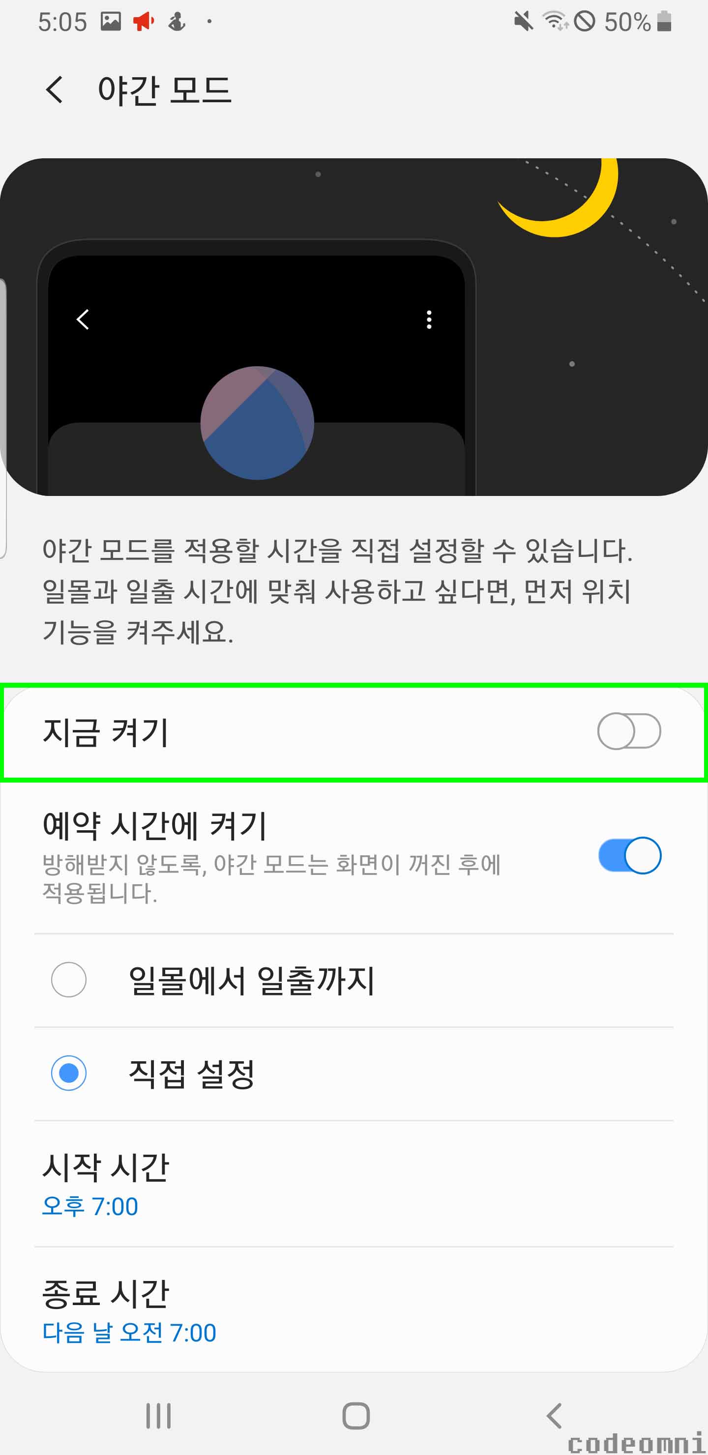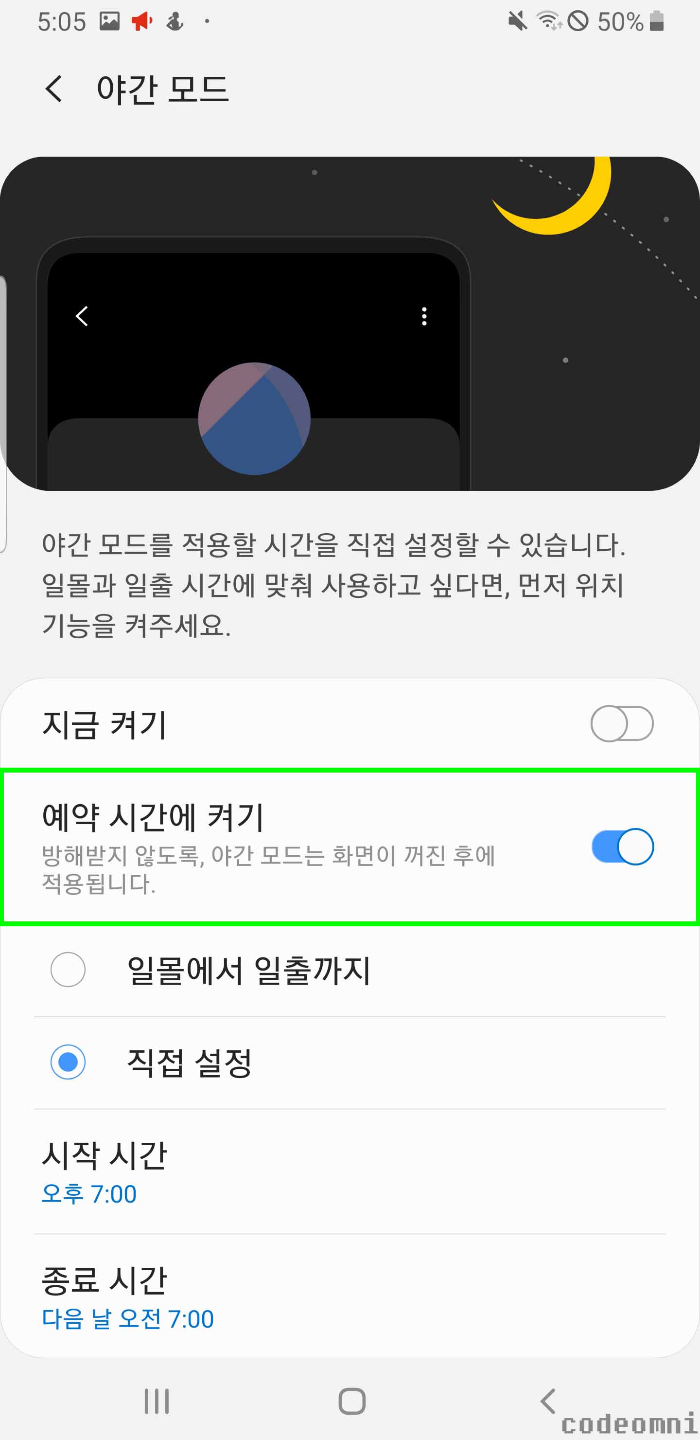 ▲ 설정된 시간에만 화면 모드를 야간 모드를 설정하고 나머지 시간에는 해제합니다.