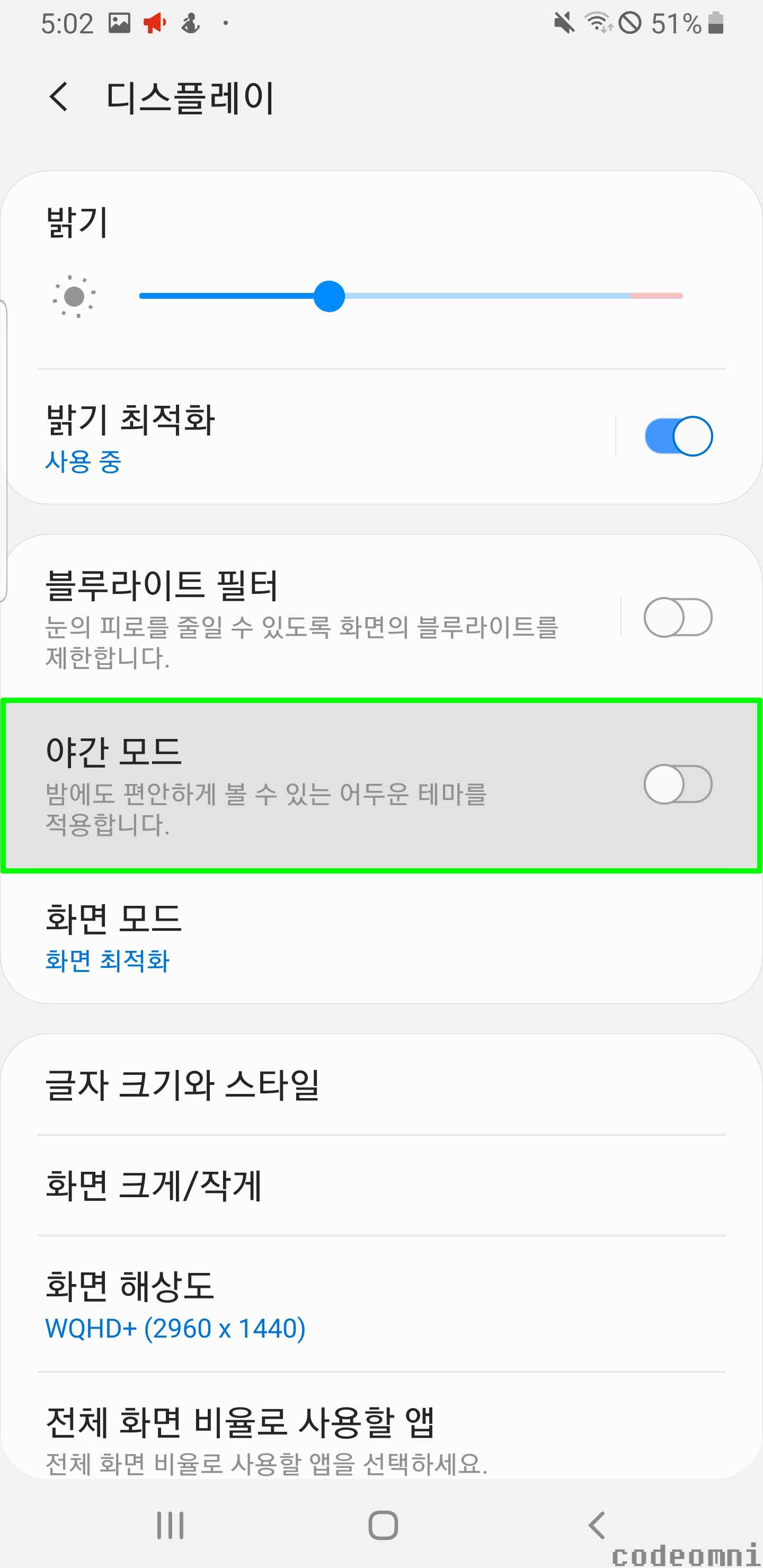 ▲ 하단으로 스크롤하여 설정 중에서 야간 모드를 터치합니다.