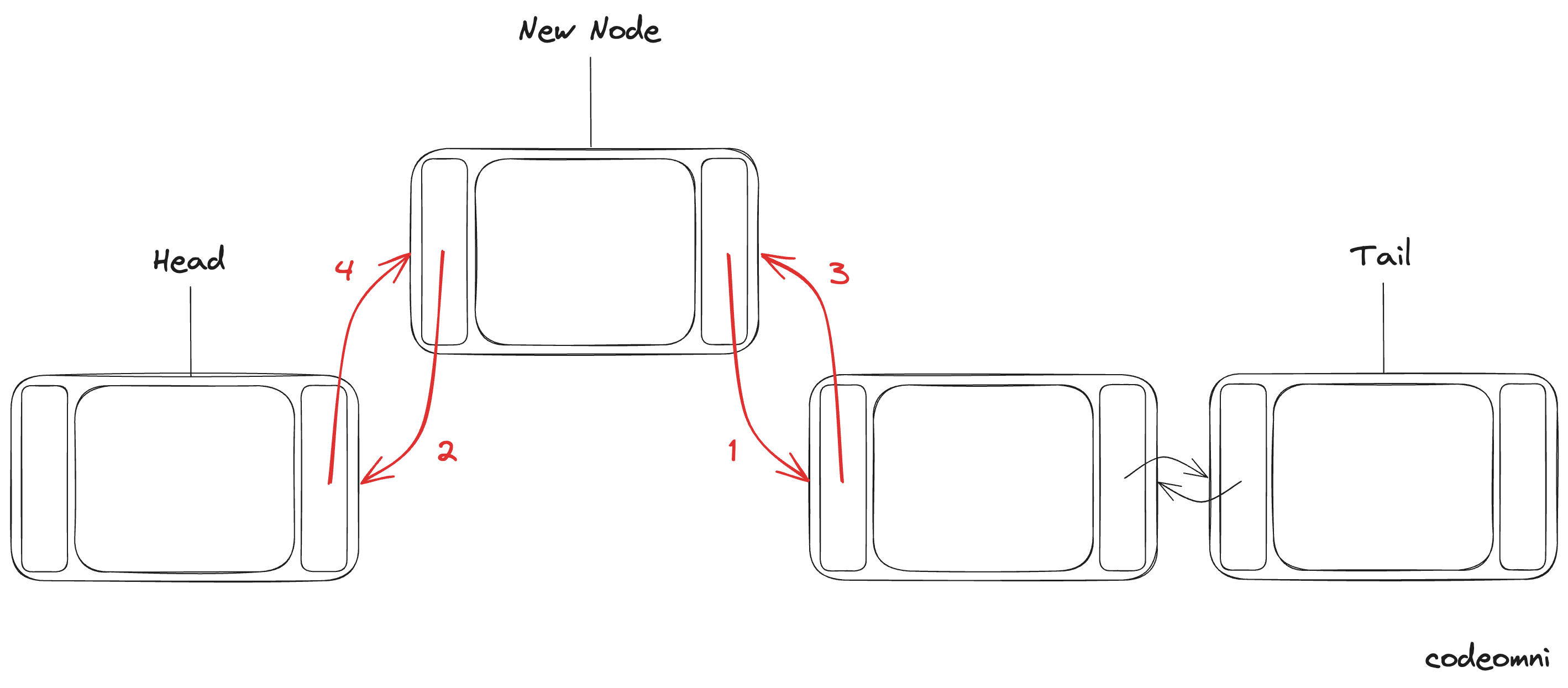 다음노드의 이전 포인터는 새 노드, 현재 노드의 다음 포인터는 새 노드를 가리킵니다.(3, 4번)