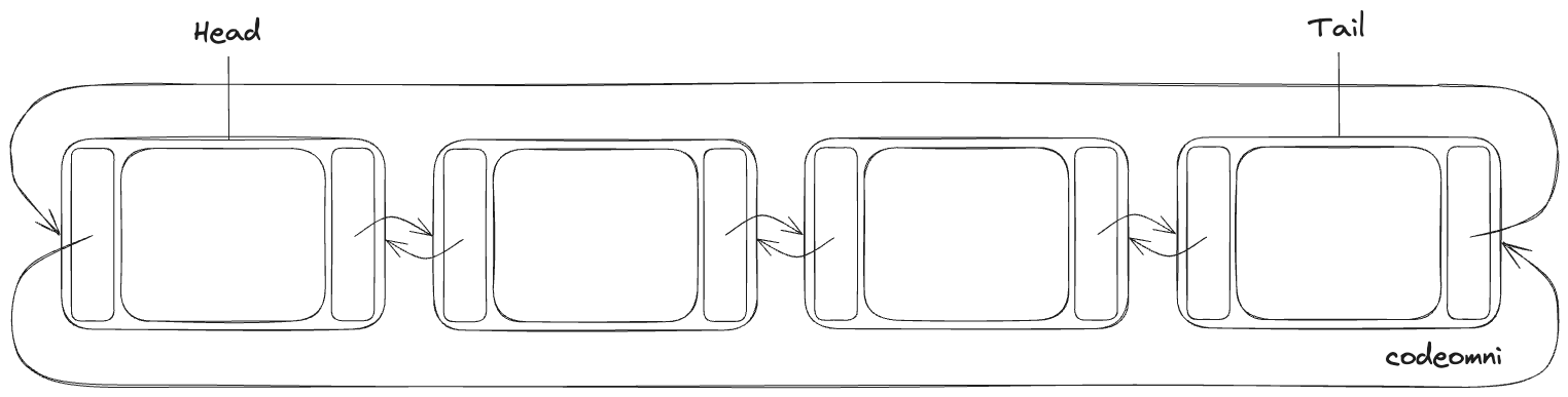 단일에서 이중 연결 리스트로 구현에서는 이전 노드의 주소를 저장하고 있는 포인터를 추가했지만, 원형 연결 리스트는 단순히 Head의 Prev 포인터가 NULL이 아니라, Tail을 가리키면 됩니다.