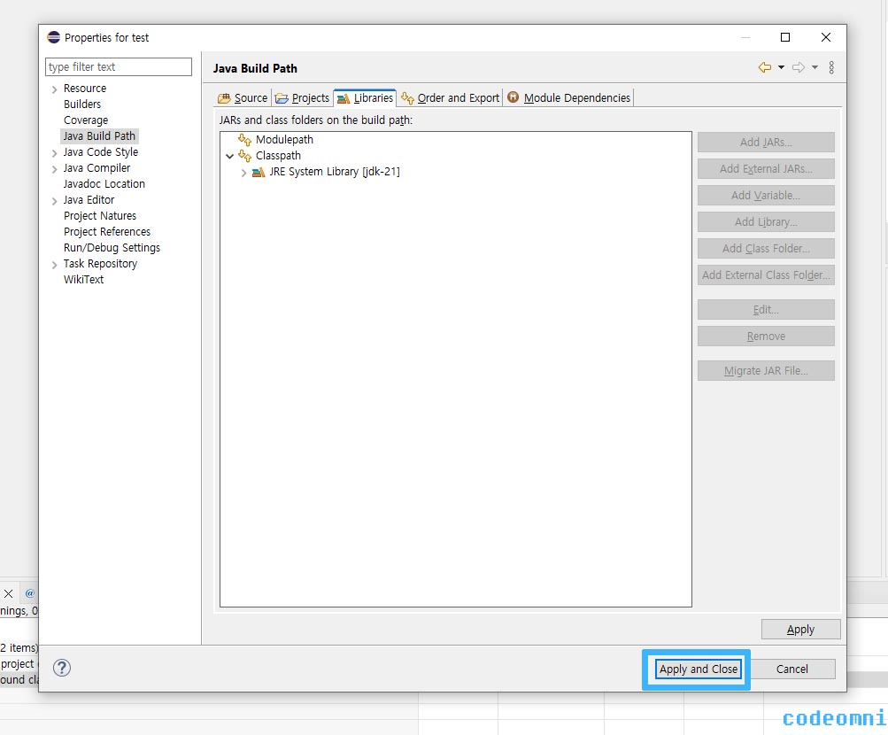 Apply and Close 버튼을 클릭해서 JRE를 적용합니다.