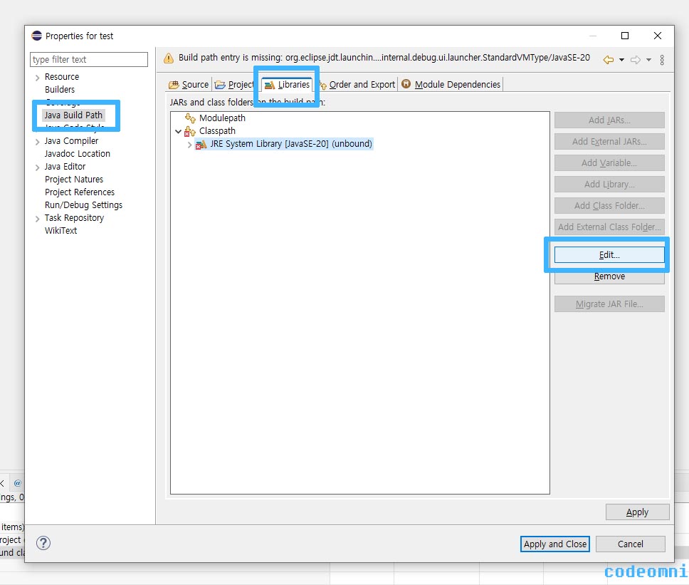 JRE System Library를 클릭한 다음에 Edit 버튼을 클릭합니다.