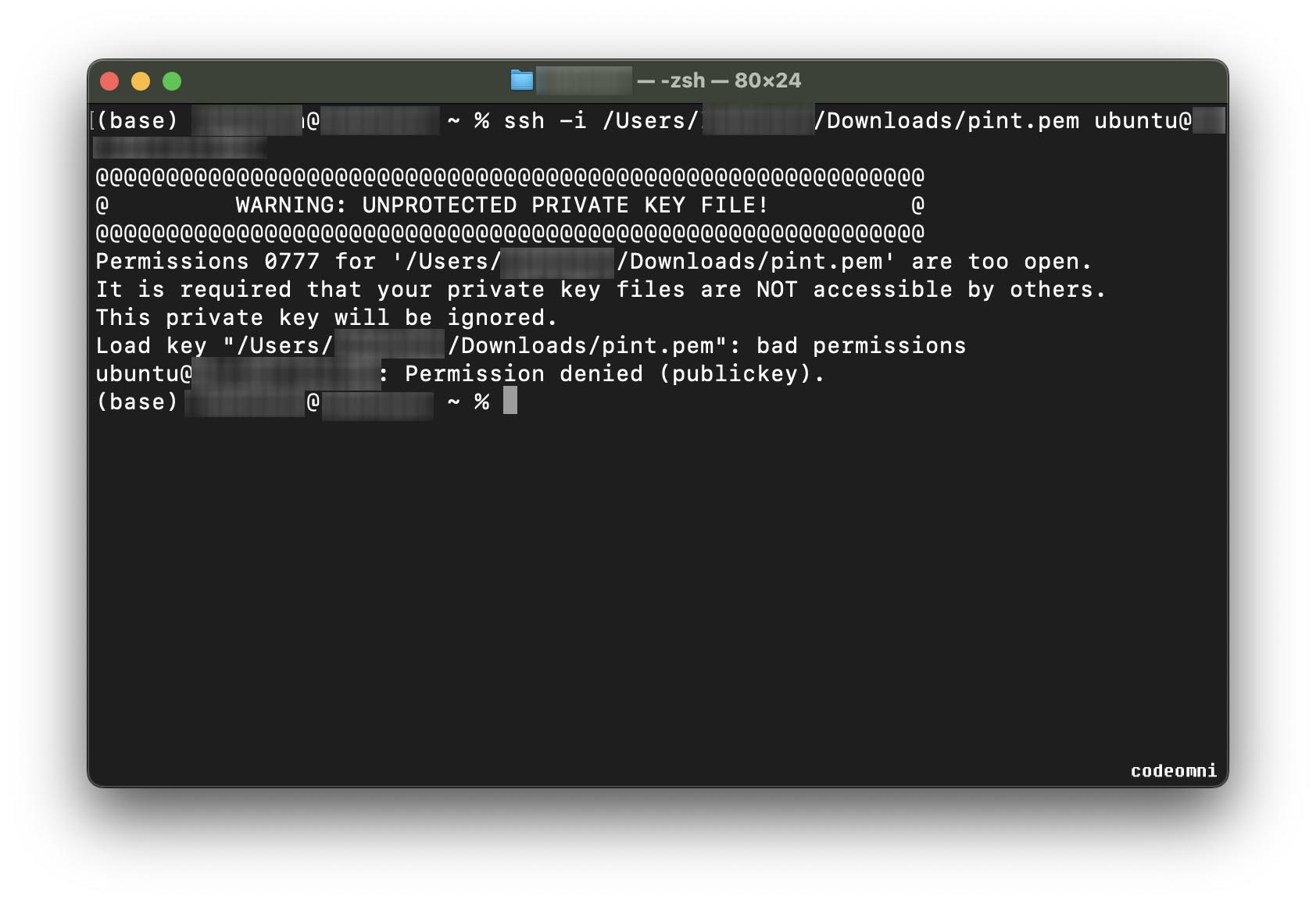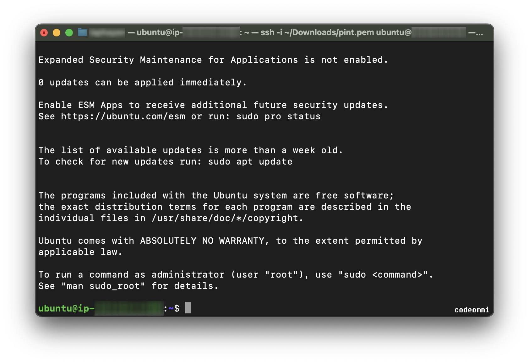 (base) codeomni@codeomni ~ % ssh -i /Users/codeomni/Downloads/pint.pem ubuntu@000.000.000.000