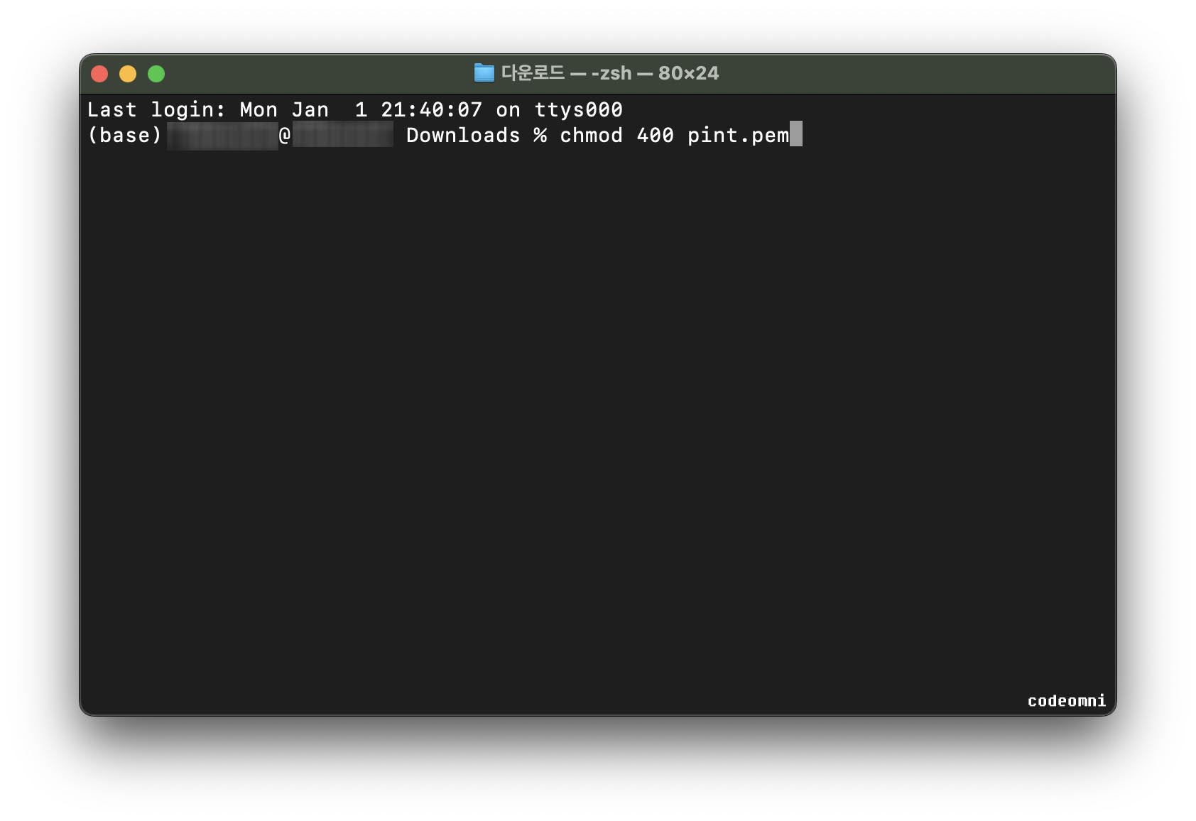 키가 저장된 위치에서 터미널을 열고 파일의 권한을 변경해주는 chmod 명령어를 사용해서 권한을 변경합니다.