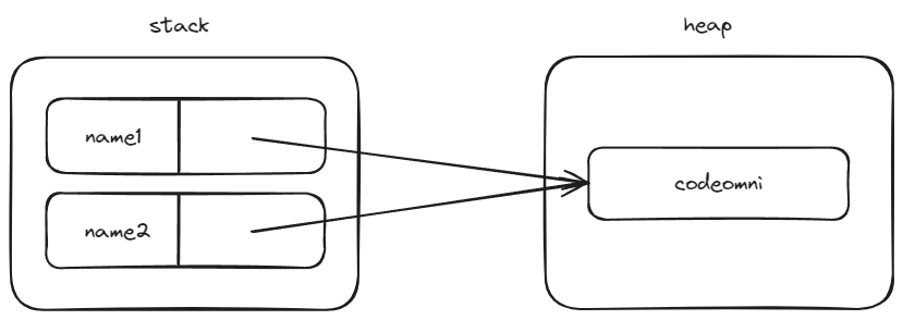 생성한 String 변수에 ""(큰따옴표)를 사용해서 문자 리터럴을 넣습니다. 이 때 주의할 것은 원하는 이름으로 지정한 변수는 스택 영역에 생성되고 ""(큰따옴표)으로 된 문자열 리터럴은 힙 영역에 String 객체로 생성됩니다. 스택영역의 변수가 힙 영역의 String 객체를 참조하고 있습니다.