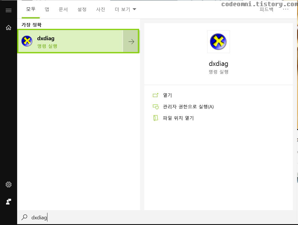 ▲ 먼저 윈도우 키나 실행을 눌러 "dxdiag"를 실행합니다.