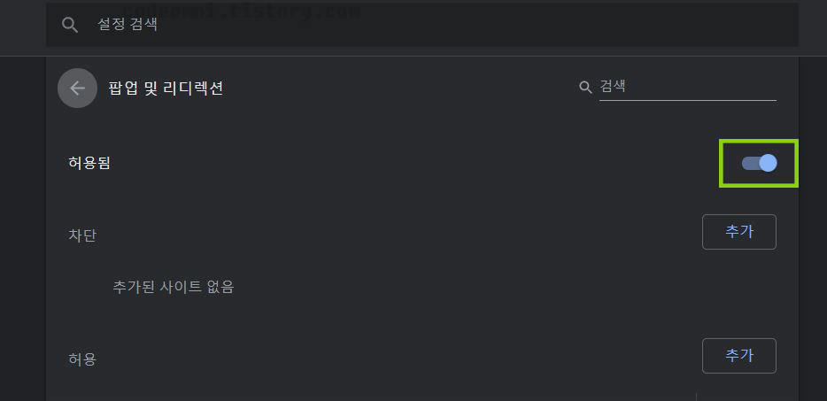 ▲ 초록색 스위치 버튼을 클릭하면 팝업이 모두 허용되고