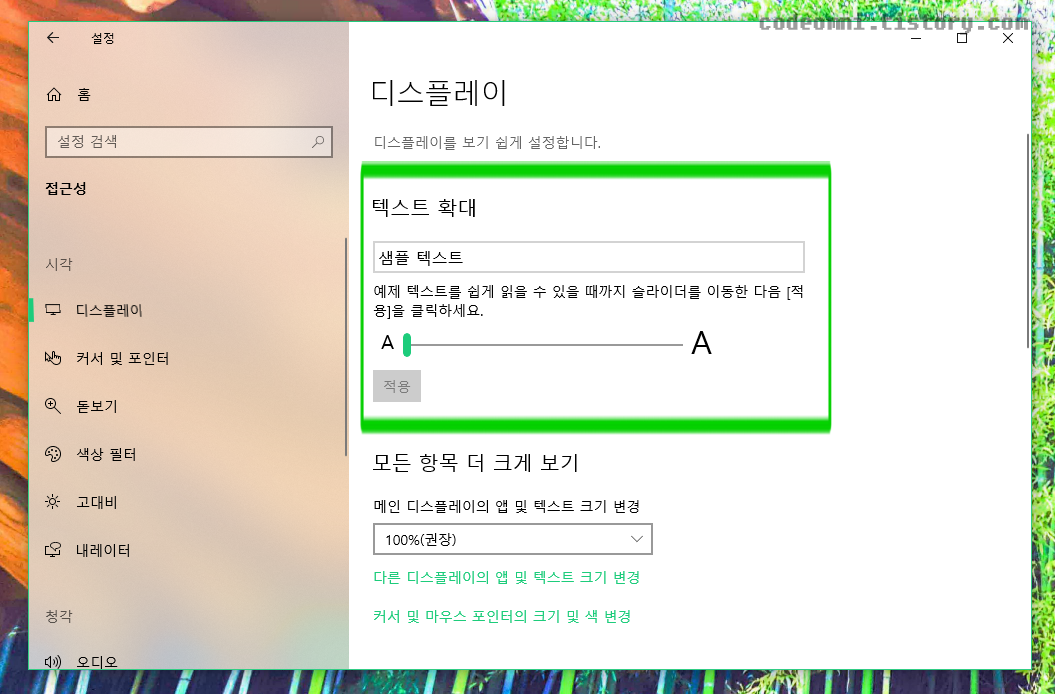 [Windows 10] 윈도우10 화면 텍스트 조절하기 글씨 크기 크게하기 작게하기 텍스트 확대 축소