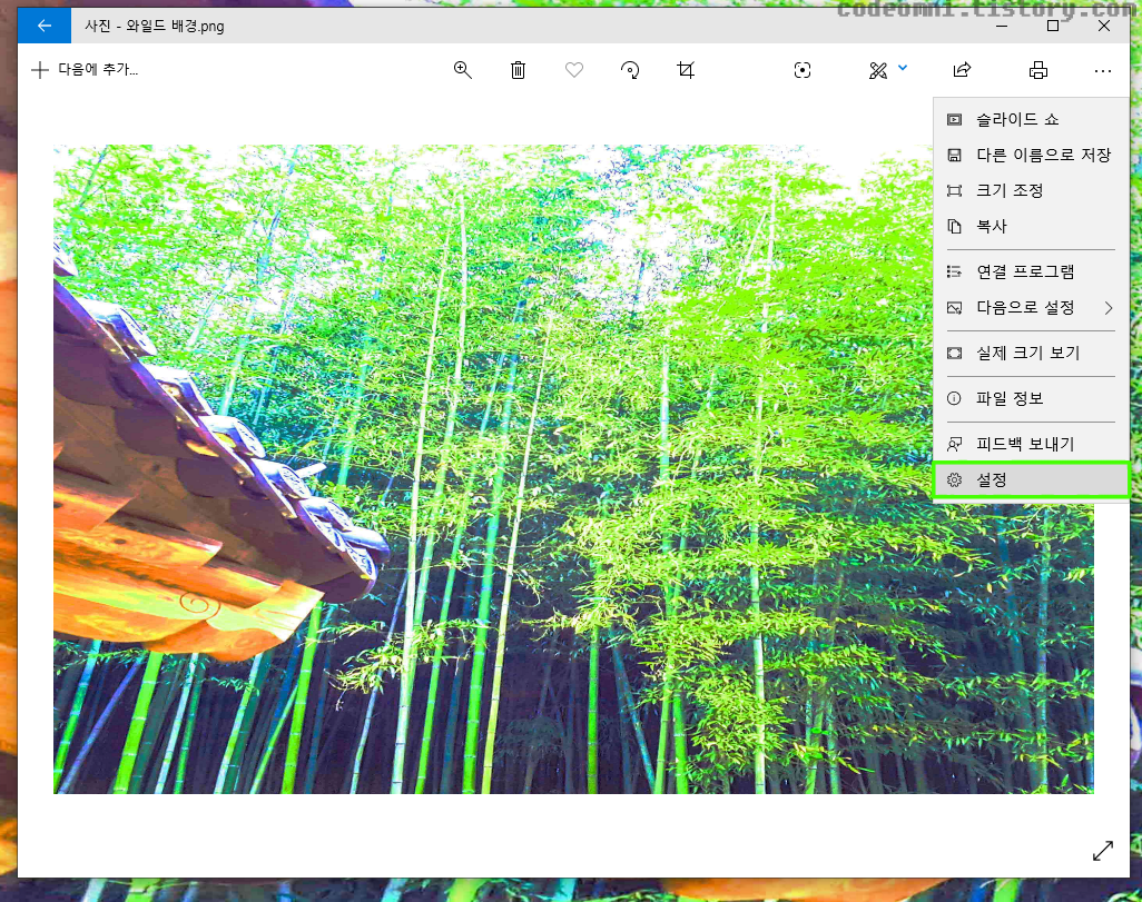 ▲ 사진에 들어갑니다. 오른쪽 상단에 보이는 메뉴에서 설정을 클릭합니다.