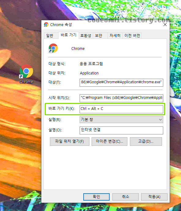 ▲ 바로 가기 탭에서 바로 가기 키(K)를 설정합니다.