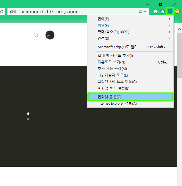 ▲ 오른쪽 상단에 설정 아이콘에서 인터넷 옵션(O)을 클릭합니다.