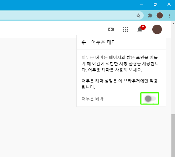 ▲ 어두운 테마: 사용 안함을 클릭합니다.