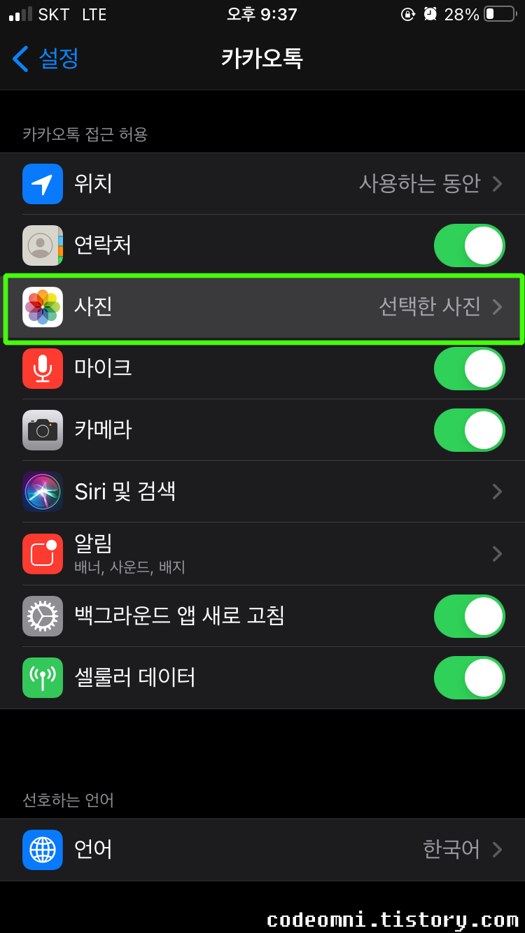 [i Phone] 아이폰 사진 접근 허용 권한 설정하기 모든 사진 선택한 사진 ios 14 업데이트 사용자의 사진에 접근하여고 합니다. 알림 끄기 켜기 카카오톡