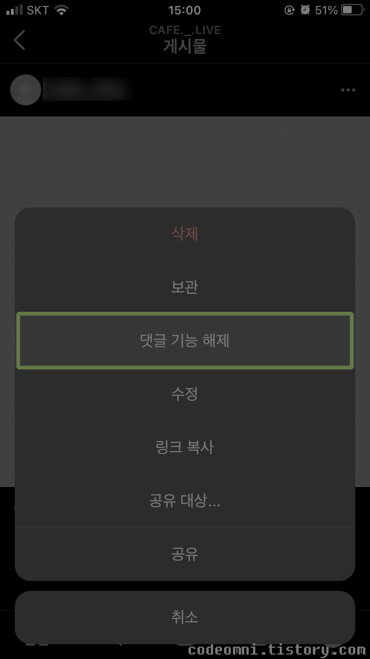 ▲ 댓글 기능 해제를 터치합니다.