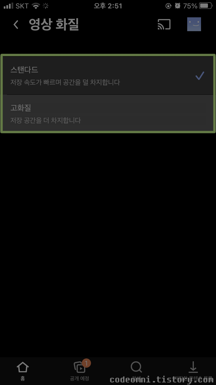 설정에서 스탠다드와 고화질을 선택할 수 있습니다.