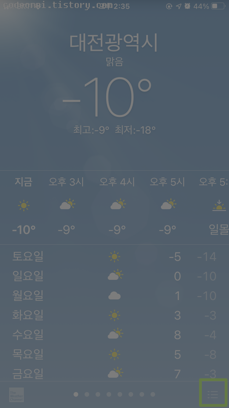 ▲ 날씨 앱에서 하단의 더보기 아이콘을 터치합니다.